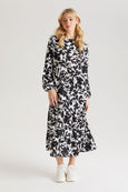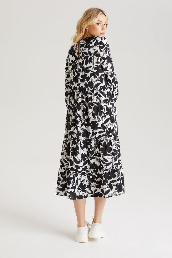 The perfect summer midi dress featuring a flawless silhouette with a floral print pattern and long puff sleeve detail.