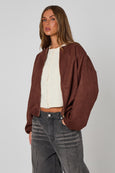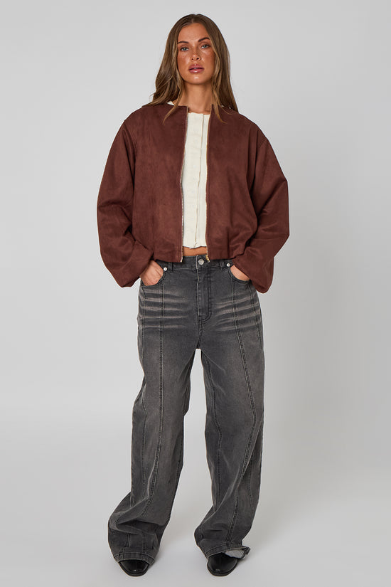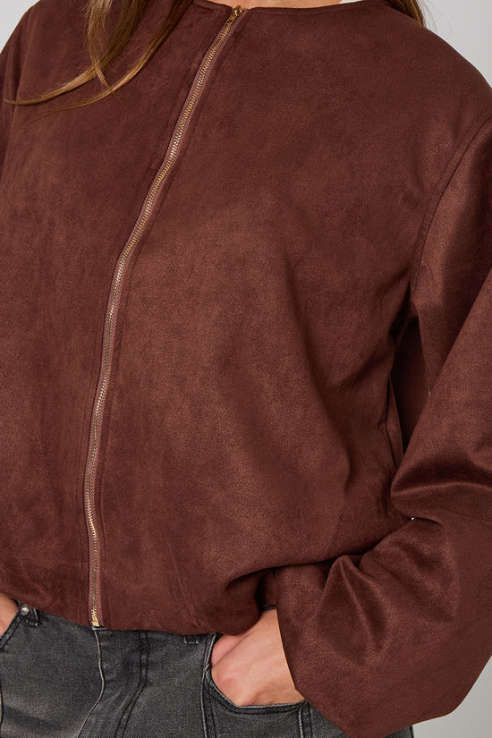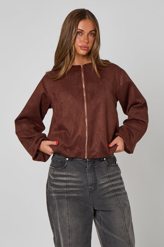 A modern twist on a timeless staple, this jacket is crafted from soft suede in a versatile chocolate shade. Designed with a distinctive bubble hem silhouette, it adds subtle volume for a flattering, contemporary shape. Featuring a clean front, structured collar, and refined detailing, this piece pairs effortlessly with both casual and elevated looks.