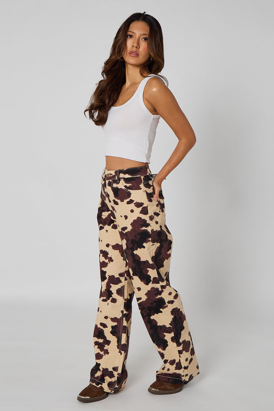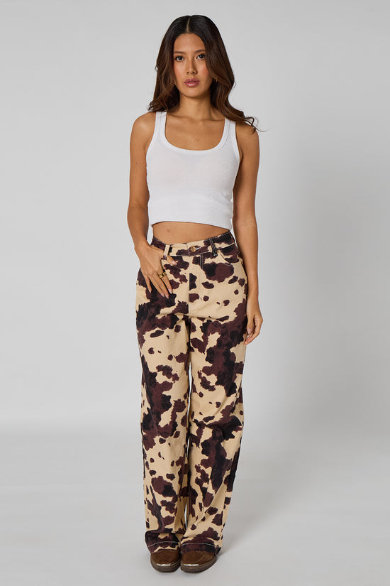 Statement cow print jeans featuring an all-over mono pattern. Cut in a straight-leg fit with a mid-rise waist, complete with five-pocket styling and zip fly fastening.