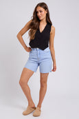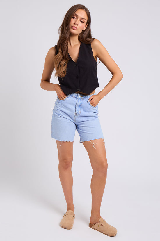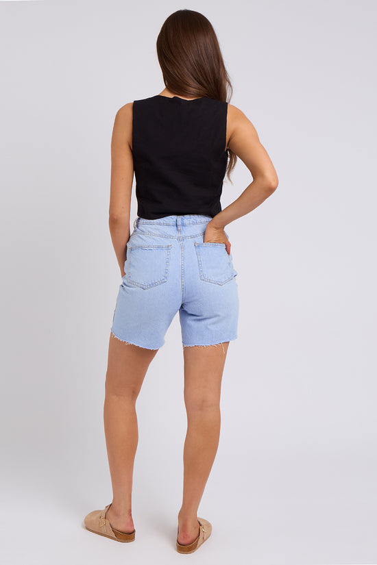 These shorts feature a high waist, slim fit, and a classic 5-pocket denim silhouette.