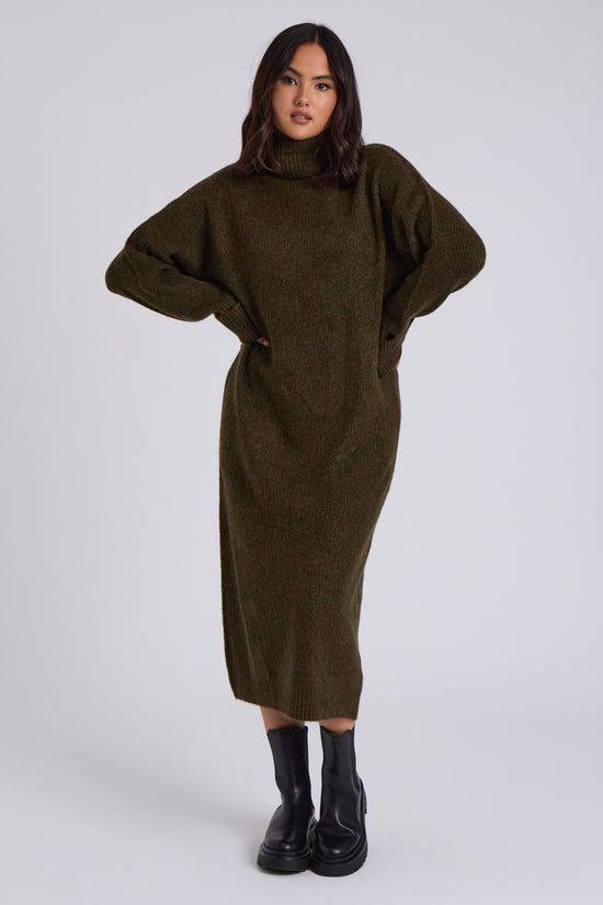 The perfect Autumn knit midi dress featuring a flawless regular silhouette with a roll neck pattern and long sleeve detail.