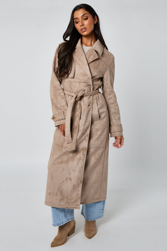 A timeless classic reimagined in soft suede. This trench coat combines a sleek, structured silhouette with the luxurious feel of suede, making it a versatile piece for both smart and casual styling. Featuring a belted waist, button fastening, and refined lapel detail, it’s the perfect outerwear investment for effortless sophistication.