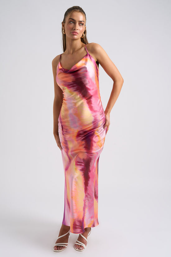 The perfect summer maxi dress featuring a flawless fitted silhouette with a tie dye pattern and delicate spaghetti straps.